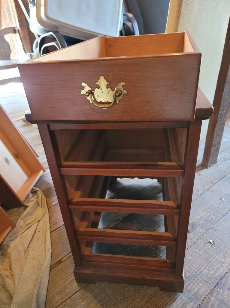 In 2021, I had received items from my grandparents once they had passed away. It was a matching set of end tables with 4 drawers included in each. They are solid wood and heavy for the average person. The original color was a plain light wood-stained color that didn’t really appeal to me. Each drawer had gold handles attached to the front of them. This project had an extremely sentimental value to it that I still keep with me in my house to this day. I thought of the name Refresh and Renew as a way to repreent this passion. Required items for this project included: