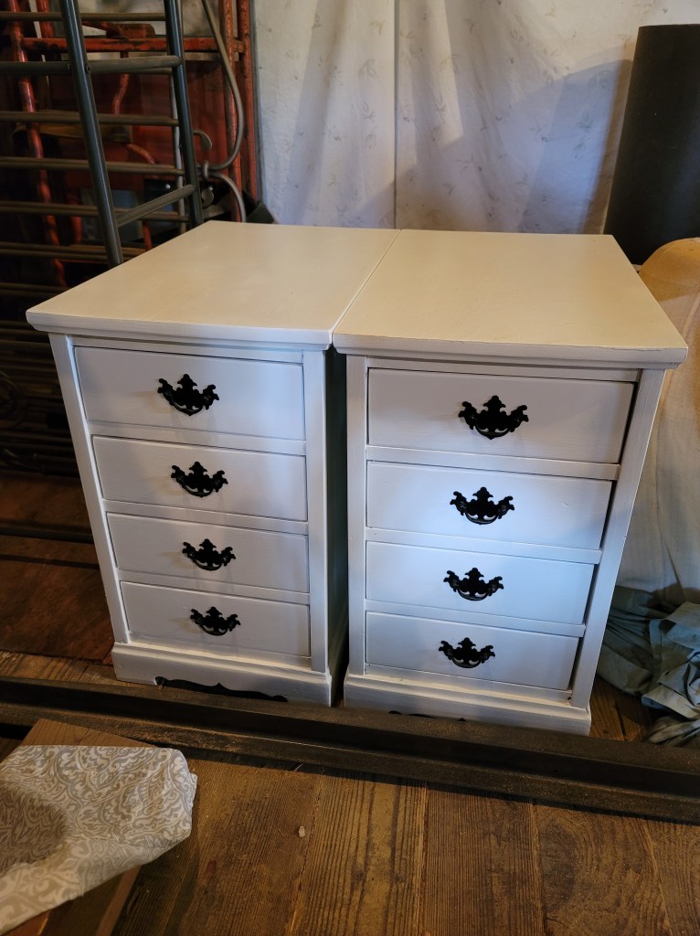 I removed all the hardware and spray painted it matte black. From there, I sanded the stain on the furniture down to bare wood in order to give it a blank layer. I chose a plain white color to provide a simple modern look that could fit into any environment. Once the first layer of white was completed and dried, I had applied an additional coat in order to solidify the coloring. I let these dry for a couple days in my parents’ barn. I reattached the hardware and put the drawers back in. These are my own personal photos of the before and after photos of them: